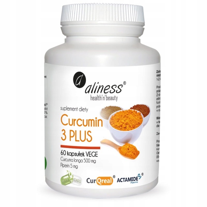 Aliness Curcumin 3 PLUS to kompozycja w 100% naturalnych kurkuminoidów, w postaci opatentowanego ekstraktu z kurkumy CurQreal®. W skład kompleksu wchodzą trzy związki chemiczne występujące naturalnie w kurkumie: kurkumina, desmetoksykurkumina (DMC) i bis-desmetoksykurkumina (BDMC). Aby zwiększyć biodostępność kurkuminoidów, skład wzbogacono o naturalny ekstrakt z pieprzu ACTAMIDE®, który zawiera 95% piperyny i jest pozyskiwany wyłącznie na drodze wodnej ekstrakcji.